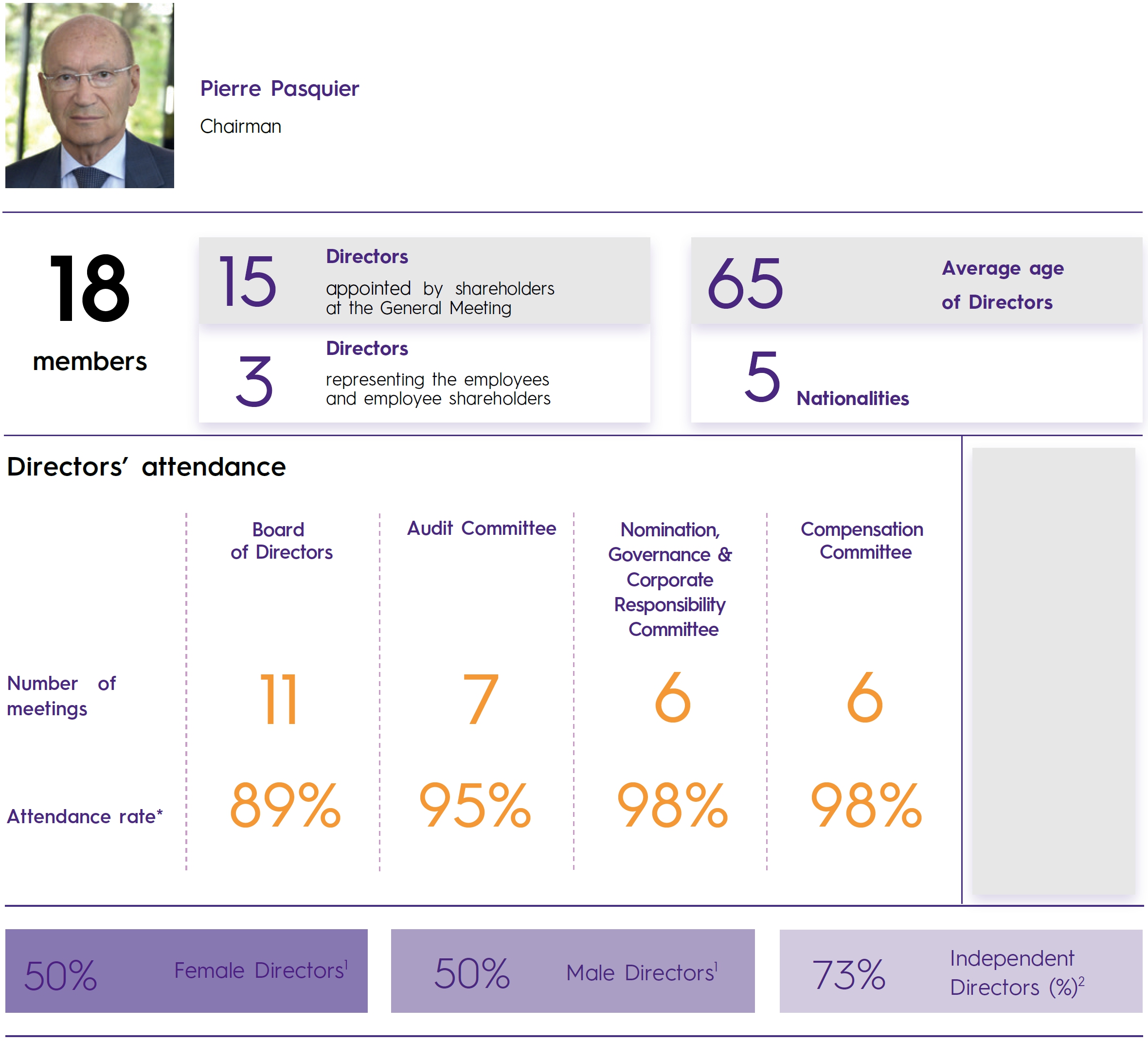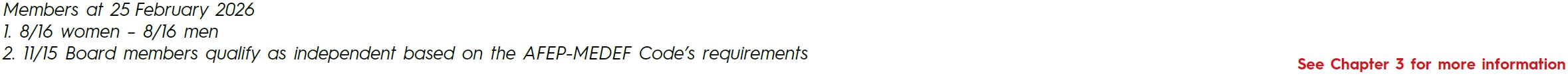Article L. 22-10-11Ownership structure of the Company 375 7 Restrictions in the Articles of Association on the exercise of voting rights and on share transfers, or clauses in agreements brought to the Company’s attention pursuant to Article L. 233-11 of the French Commercial Code 376 7 Direct or indirect interests in the Company’s share capital of which it is aware pursuant to Articles L. 233-7 and L. 233-12 of the French Commercial Code 375 7 List of holders of any shares granting special rights and description thereof 375 7 Agreements between shareholders of which the Company is aware and which may give rise to restrictions on share transfers and the exercise of voting rights 378 7 Rules applicable to the appointment and replacement of members of the Board of Directors and to amendments of the Articles of Association 385 7 Powers of the Board of Directors, in particular for share issues or share buybacks 379; 382-385; 392 7; 8 Agreements entered into by the Company that are amended or cease in the event of a change in control of the Company, unless this disclosure would seriously undermine its interests, except when such disclosure is a legal obligation N/A N/A Agreements providing for benefits payable to members of the Board of Directors or employees if they resign or are dismissed without valid grounds or if their employment is terminated due to a public tender or exchange offer N/A N/A Required items Articles Page Chapter ANNUAL FINANCIAL REPORT Article L. 451-1-2 of the French Monetary and Financial Code; Article L. 222-3 of AMF’s General Regulation 1. Parent company financial statements 333-366 6 2. Consolidated financial statements 267-328 5 3. Management Report See “Cross-reference table for the Management Report” 436-437 4. Report on Corporate Governance See “Cross-reference table for the Report on Corporate Governance” 438-439 5. Declaration by the persons responsible for the Annual Financial Report 429 6. Statutory Auditors’ reports on the parent company financial statements and the consolidated financial statements 367-370; 329-332 6; 5 Item Page Chapter Vigilance plan covering the Group’s operations Governance 4.1.2 210 4 Risk mapping 4.2.1 215 4 Risk mitigation and prevention plan 4.2.1 215 4 Human rights and fundamental freedoms 4.2.2 216-217 4 Health and safety 4.2.2 216-217 4 Environment 4.2.2 216-217 4 System to monitor measures taken 4.2.1 - 4.2.2 215-217 4 Vigilance plan covering the Group’s purchasing Governance 4.1.2 210 4 Risk mapping 4.1.1 210 4 Risk mitigation and prevention plan 4.1.3 211-212 4 Human rights and fundamental freedoms 4.1.3 211-212 4 Health and safety 4.1.3 211-212 4 Environment 4.1.3 211-212 4 System to monitor measures taken 4.1.4 214 4