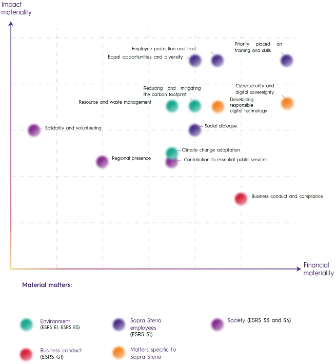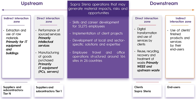 Sopra Steria has conducted a double materiality assessment,1 the outcome of which has confirmed the Company’s priorities, some of them long-standing, while providing a fresh perspective on the value chain.