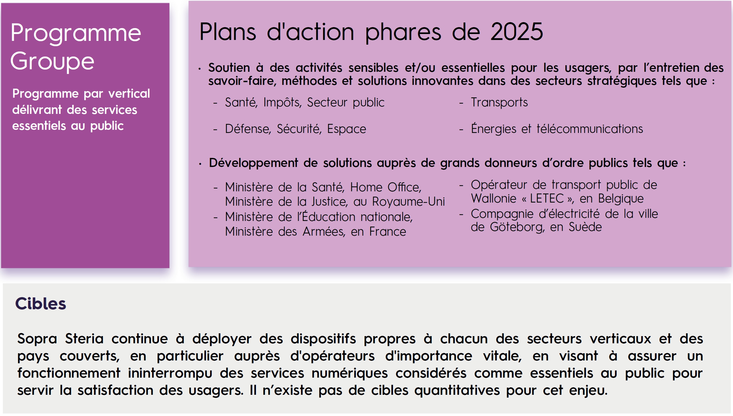 Sopra Steria souhaite s’affirmer comme un leader européen des services du numérique et se positionner comme une alternative crédible et de confiance en Europe face à des acteurs mondiaux. Le Groupe a développé et renforce son empreinte sur quatre marchés stratégiques (secteur public, services financiers, défense & sécurité, aéronautique et spatial) où les enjeux de souveraineté et de numérique responsable sont de plus en plus critiques en Europe. Il s’appuie sur une logique d’offre à forte valeur ajoutée ainsi que sur une approche industrielle et durable dans la mise en œuvre des technologies. L’ambition du Groupe est d’agir et d’innover afin d’être en mesure d’avoir une influence sur l’utilisation de la technologie par ses parties prenantes.