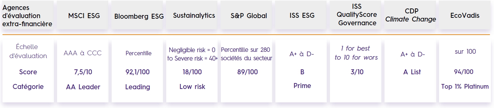 - Matrice de matérialité : L’analyse de matérialité permet d’identifier et de hiérarchiser les enjeux les plus pertinents pour l’entreprise et ses parties prenantes, et est représentée graphiquement sous la forme d’une matrice, qui positionne ces enjeux selon leur importance pour l’entreprise en abscisse et pour ses parties prenantes externes en ordonnée.