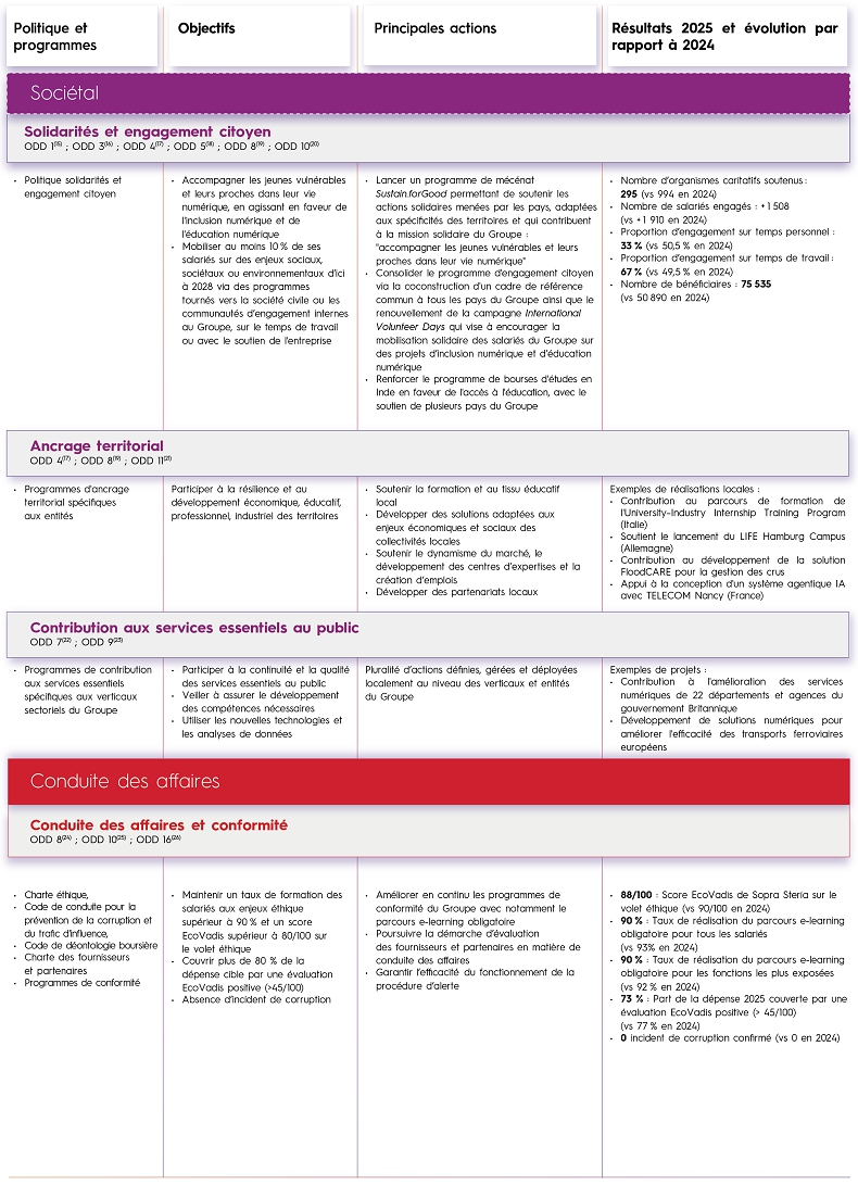 Sopra Steria s’engage pleinement dans la gestion de ses enjeux de durabilité pour assurer sa performance en tant qu’entreprise responsable et répondre aux attentes de ses parties prenantes. Les résultats obtenus témoignent de l’engagement concret du Groupe dans les domaines social, environnemental et sociétal.
